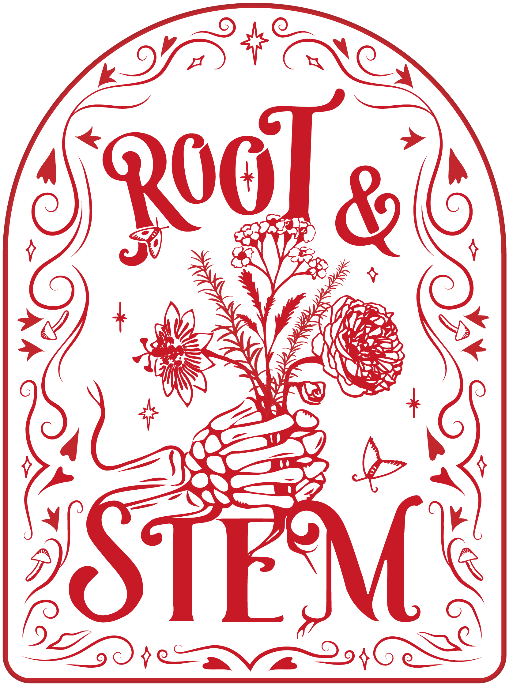 Root and Stem is a whimsical brand that highlights the benefits of all-natural herbal tinctures for overall well-being. The logo features a skeletal hand holding a bouquet of yarrow, rosemary, passion flower, and roses. Accompanying these elements are detailed illustrations of butterflies, moths, and stars. The design is framed by an arch of decorative line elements that includes hidden mushrooms and foliage.